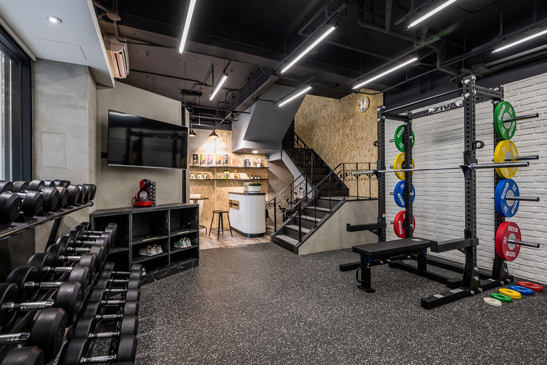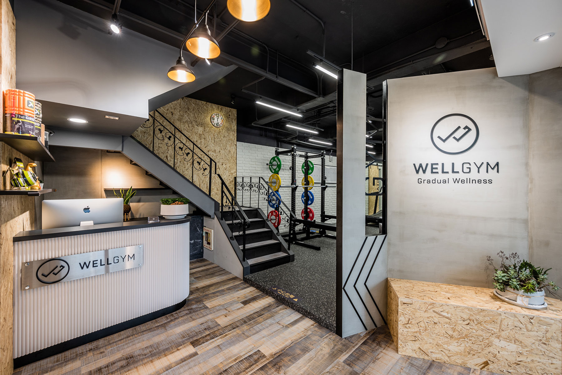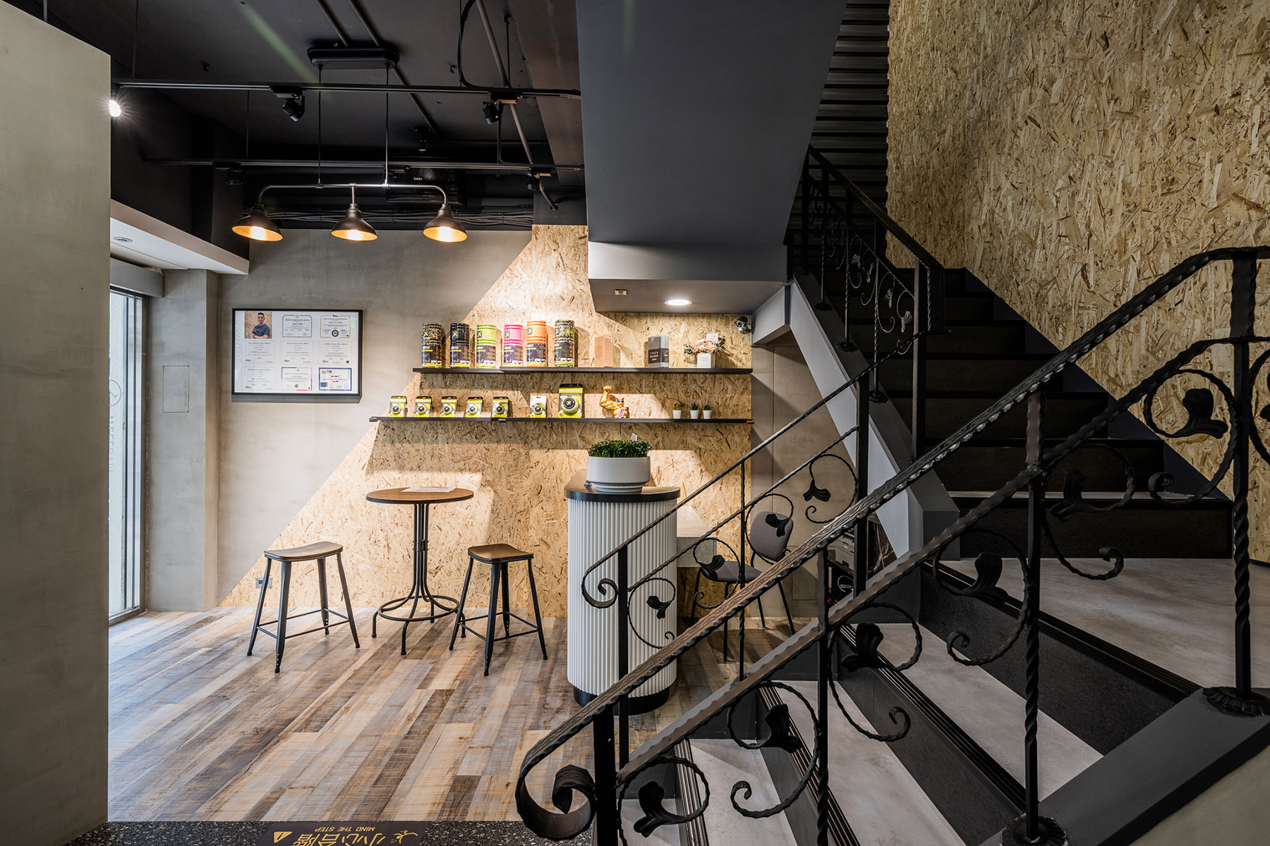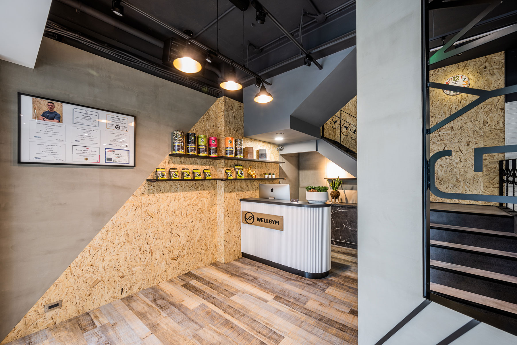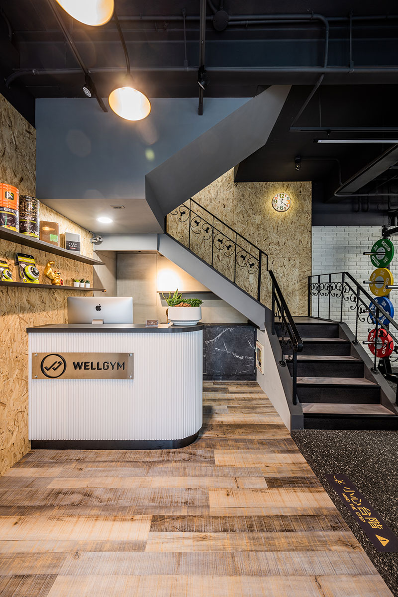 色調以黑白灰為主,卻又相當強調空間立體感,把 #輕工業 風格於其中發揮得淋漓盡致,簡單大方不複雜。一二樓空間以課程配置及器材功能不同做出區隔,健身房運動的寬敞大空間也能充分利用每一坪。