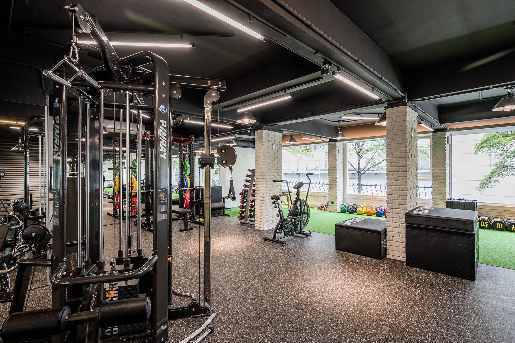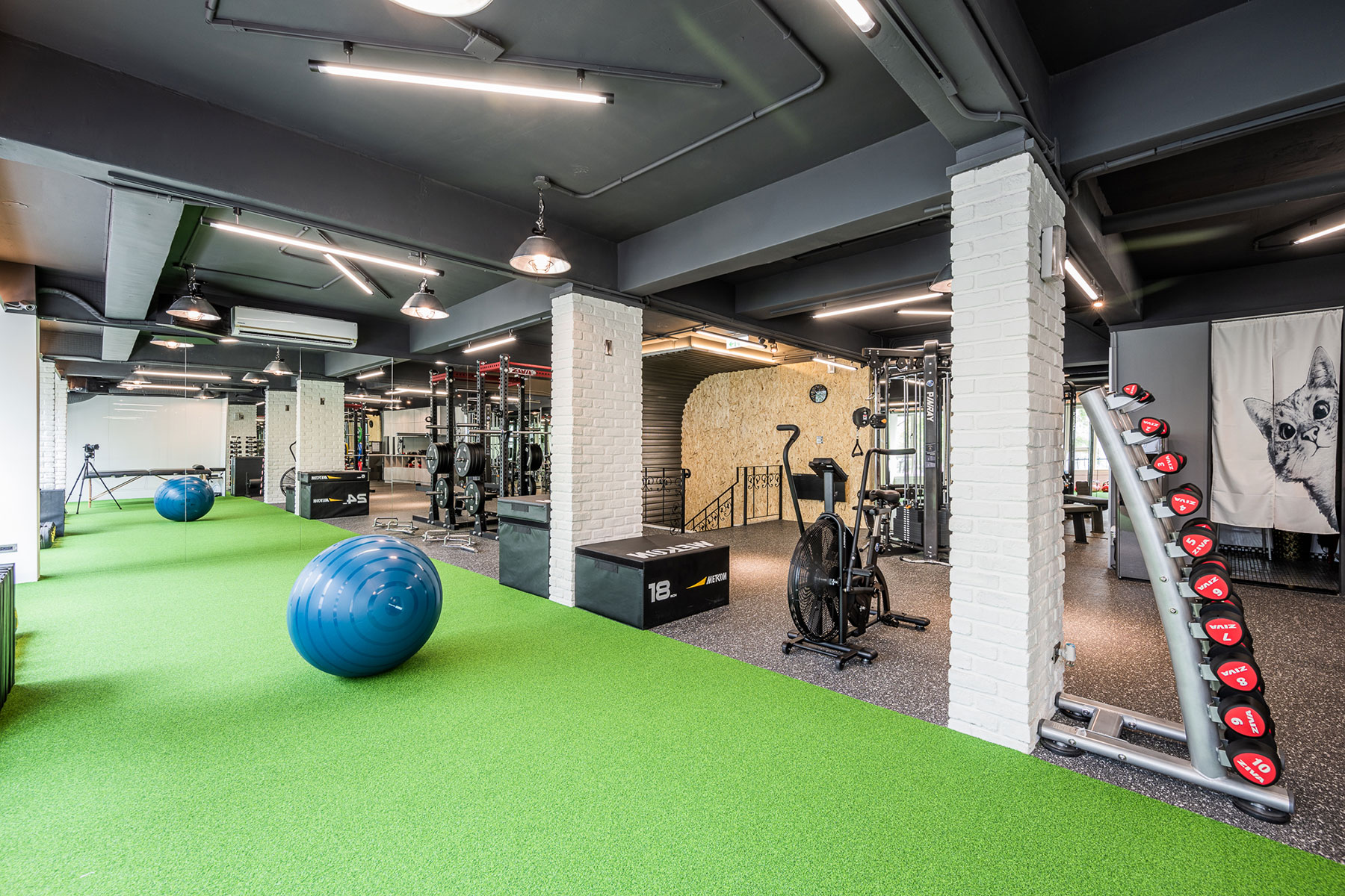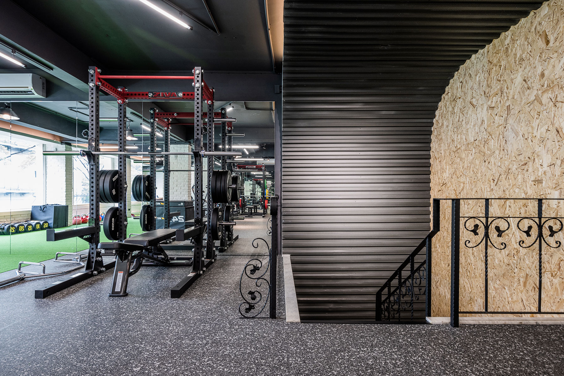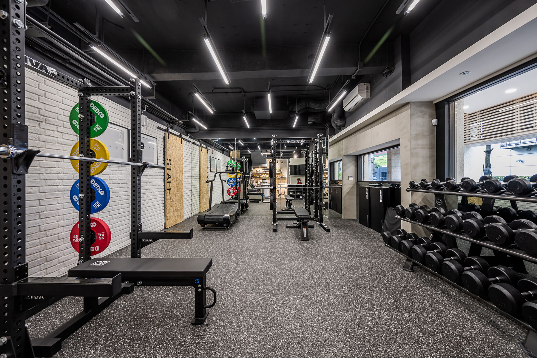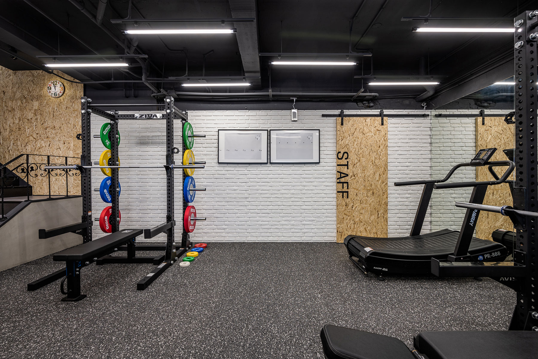 色調以黑白灰為主,卻又相當強調空間立體感,把 #輕工業 風格於其中發揮得淋漓盡致,簡單大方不複雜。一二樓空間以課程配置及器材功能不同做出區隔,健身房運動的寬敞大空間也能充分利用每一坪。