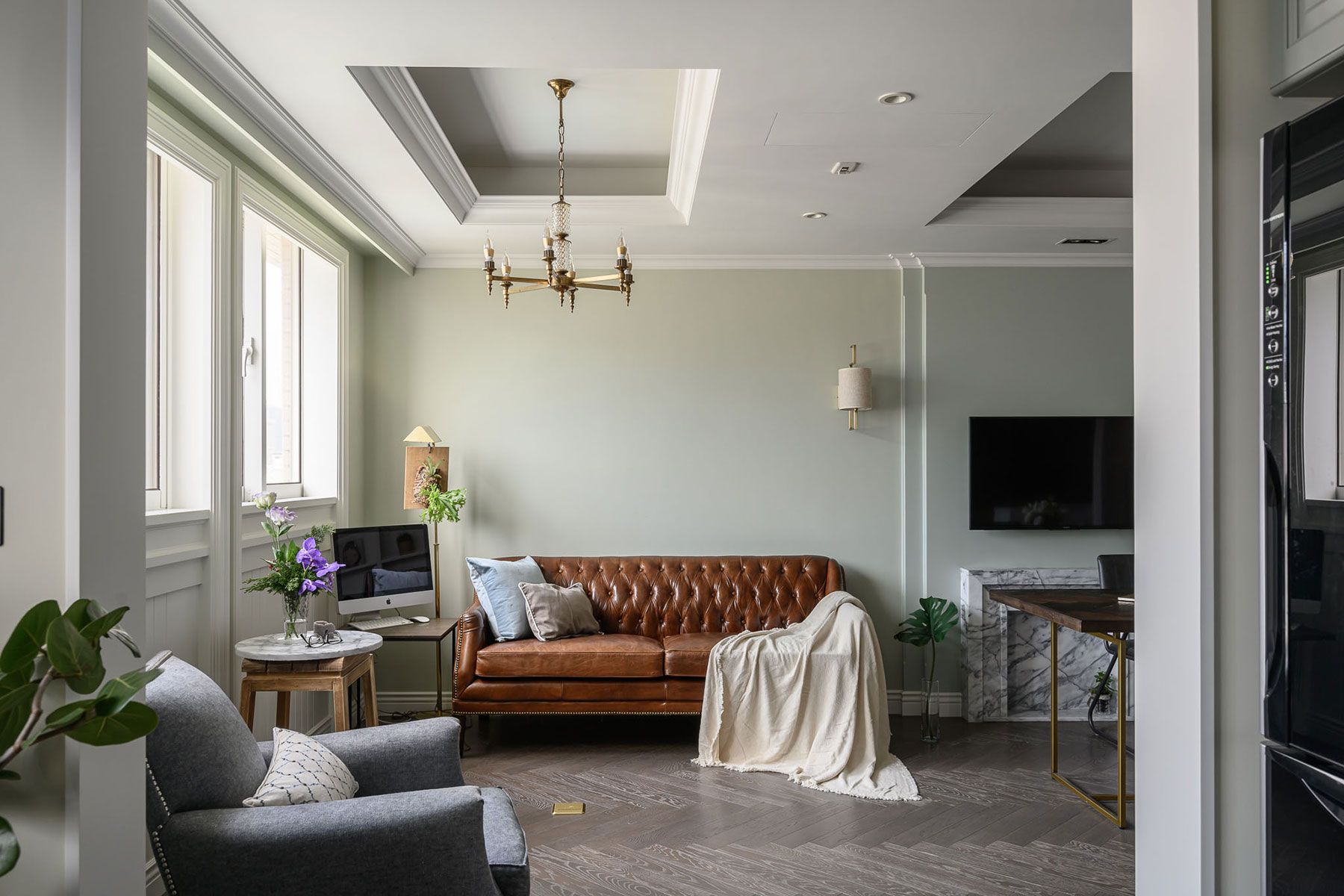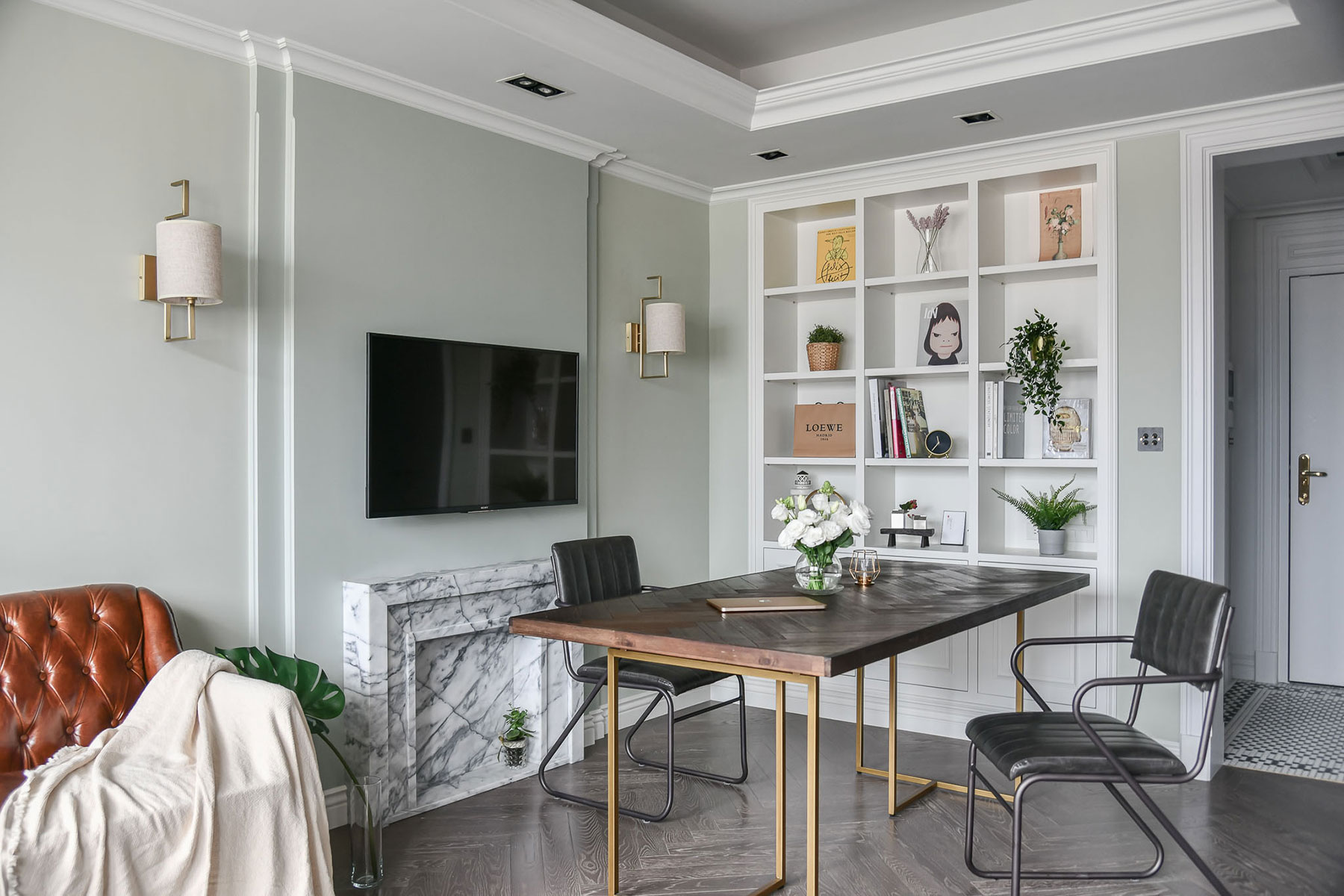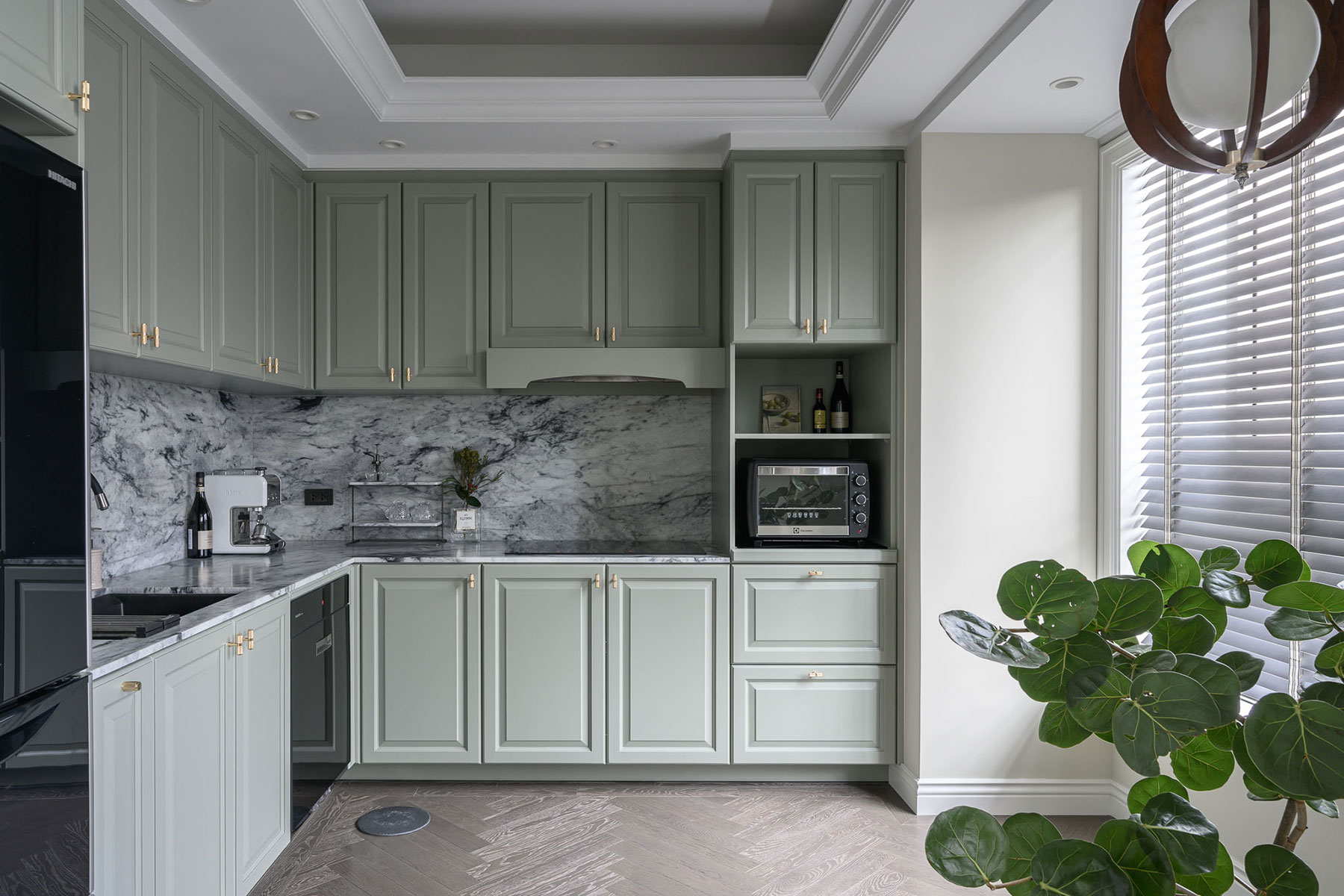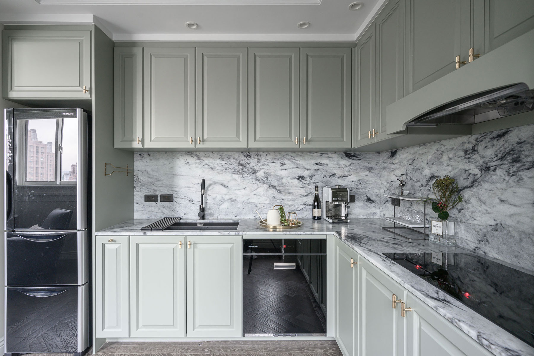 實木地板人字拼染色、手工窯變磚、挪威森林大理石、金屬烤漆、美式線板、消光烤漆廚具、實木百葉