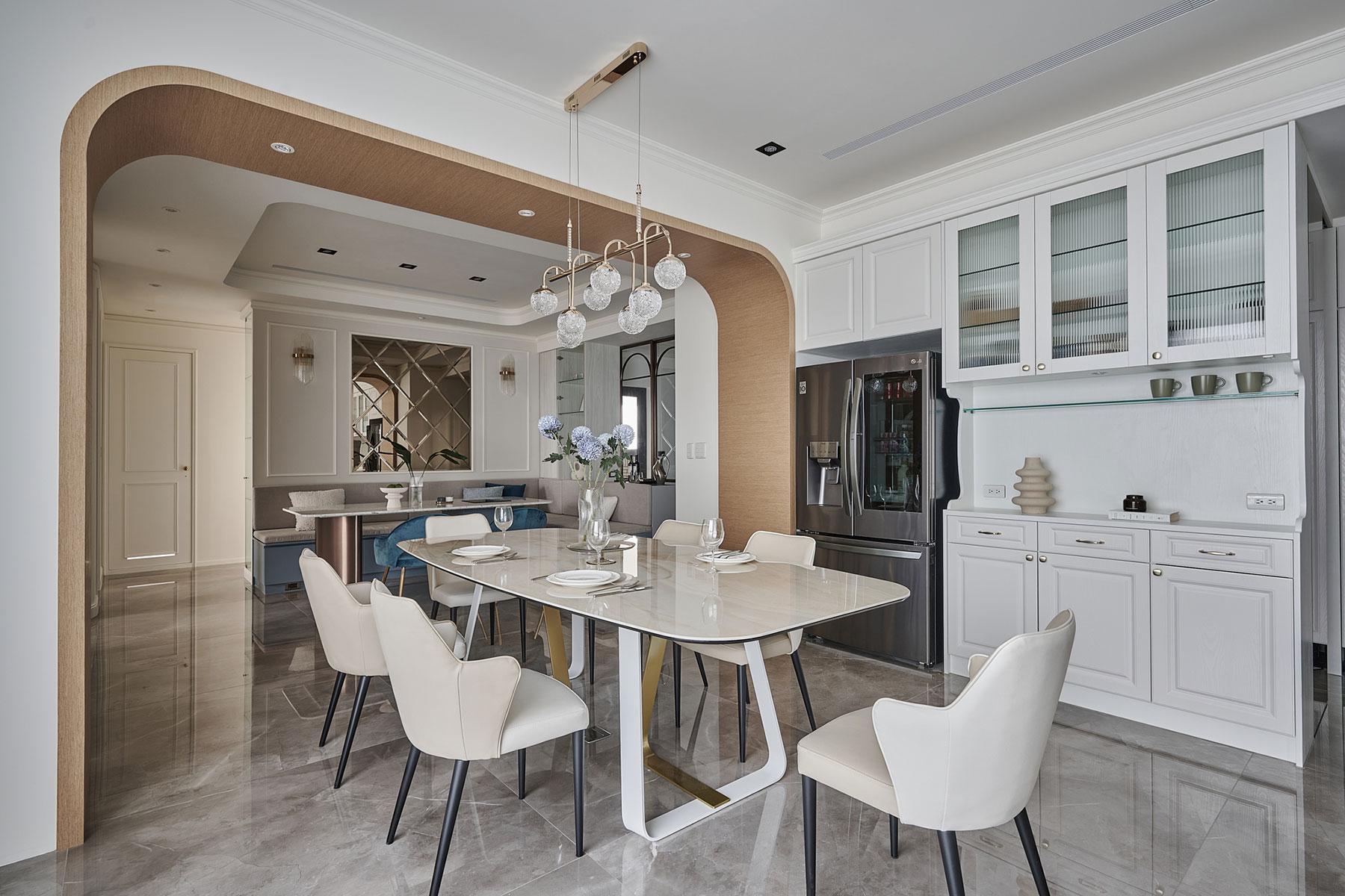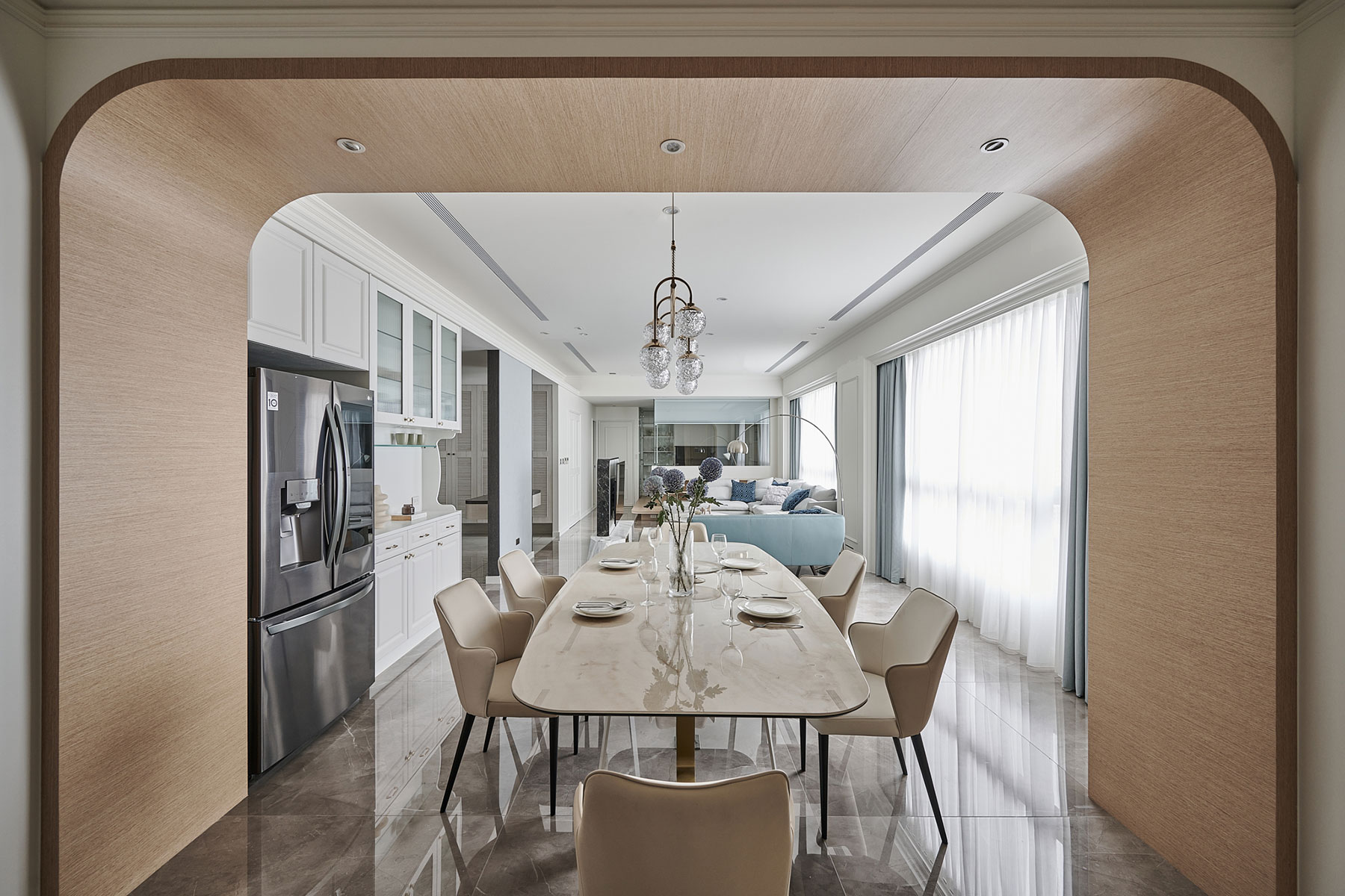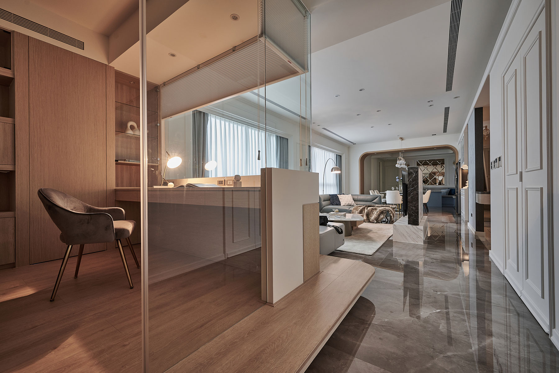 回應業主對寬敞家居的嚮往,我們規劃開放式公領域,配合書房、廚房的清玻牆面、推拉門,構築開闊通透的明亮場域之餘,也令住者無論身處何地皆可照看彼此和訪客,另因應本案兩戶打通的格局,玄關分別安排通往餐廳與客廳的兩條路徑,打造流暢便利的雙動線,並將主臥與長親房劃設於屋件兩端,留予屋主夫妻及長輩各自的獨立空間,顧及雙方隱私性。