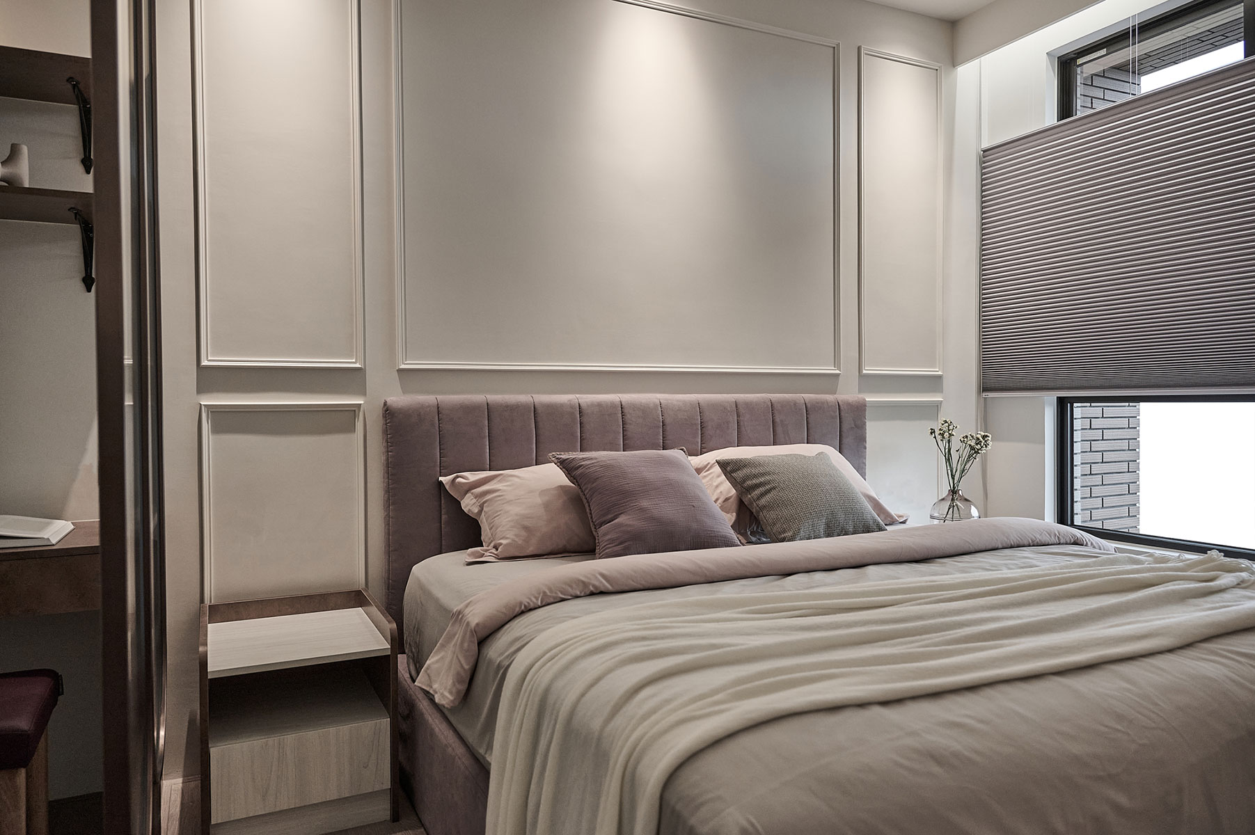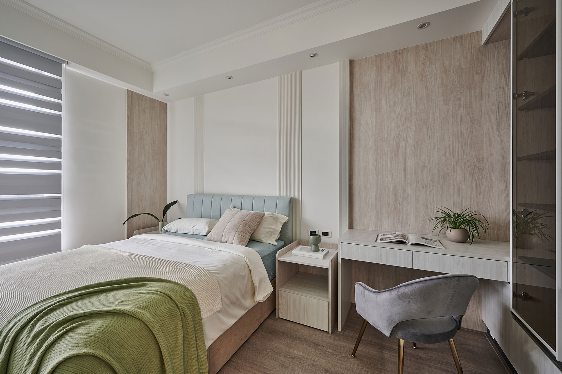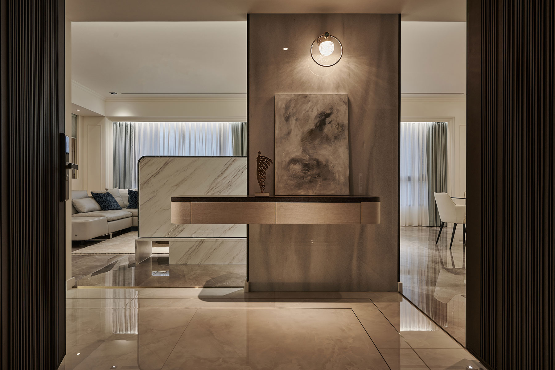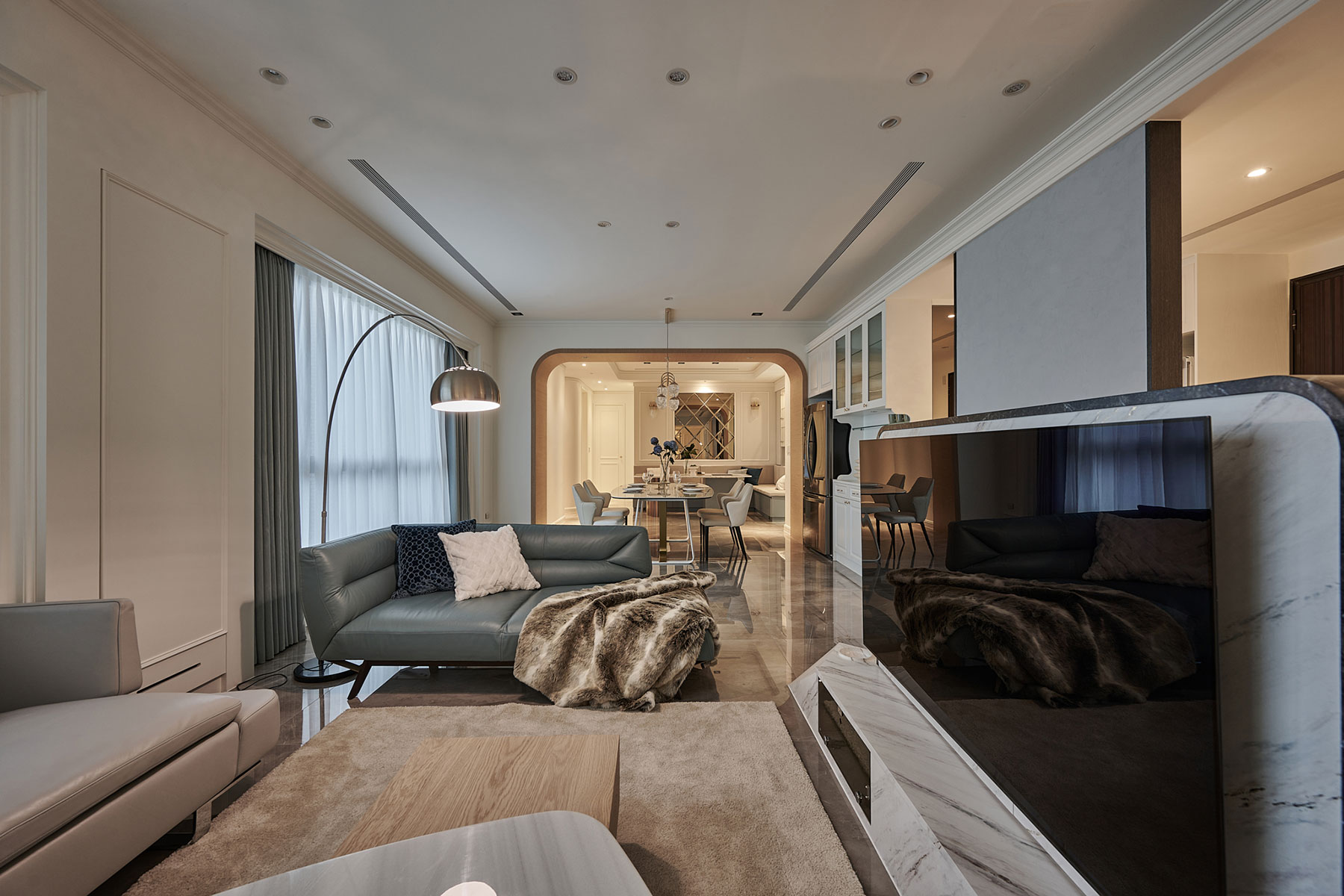 回應業主對寬敞家居的嚮往,我們規劃開放式公領域,配合書房、廚房的清玻牆面、推拉門,構築開闊通透的明亮場域之餘,也令住者無論身處何地皆可照看彼此和訪客,另因應本案兩戶打通的格局,玄關分別安排通往餐廳與客廳的兩條路徑,打造流暢便利的雙動線,並將主臥與長親房劃設於屋件兩端,留予屋主夫妻及長輩各自的獨立空間,顧及雙方隱私性。