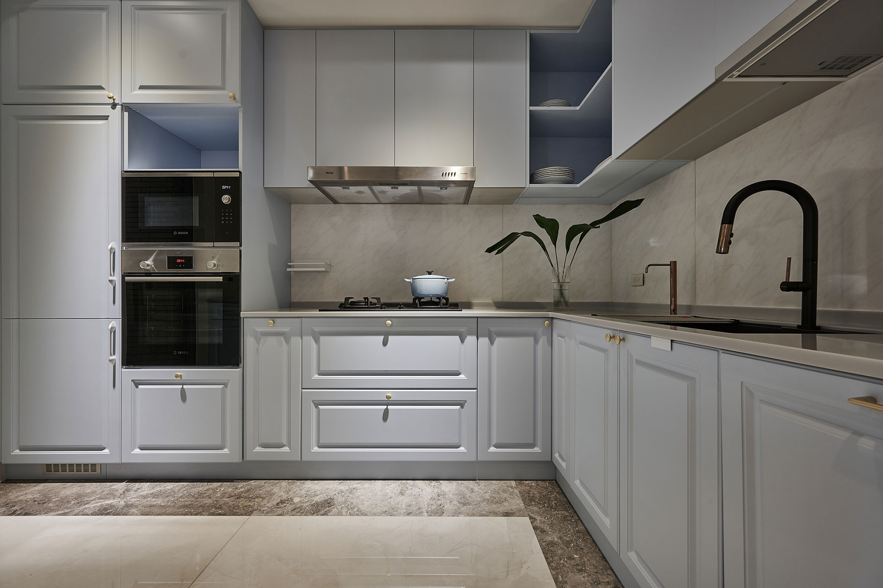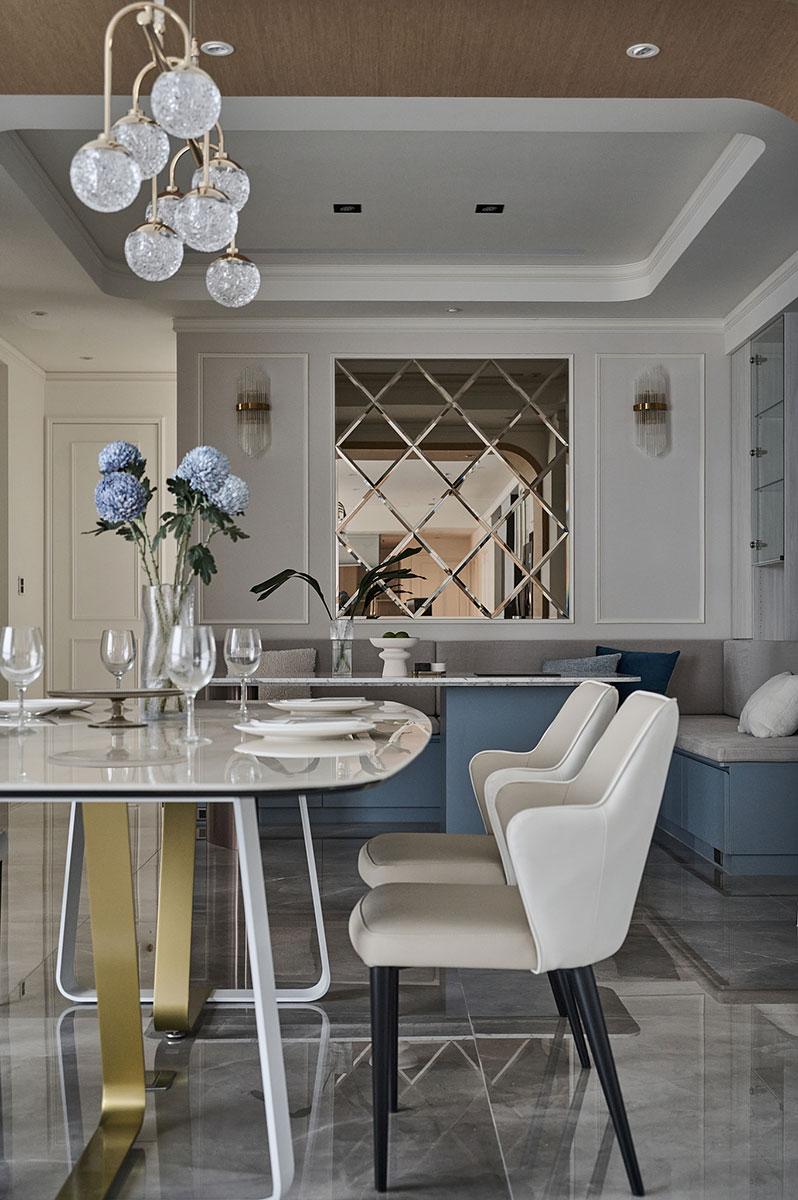 Warm natural light emits through the sheer curtains and puts a little light and elegant makeup on the interior. With interspersing blue touches, the entire space features a beach-like freshness. After the hustle and bustle of work, the homeowners long to rest with a cup of coffee and settle their minds in the breezy and wavy-designed coziness.