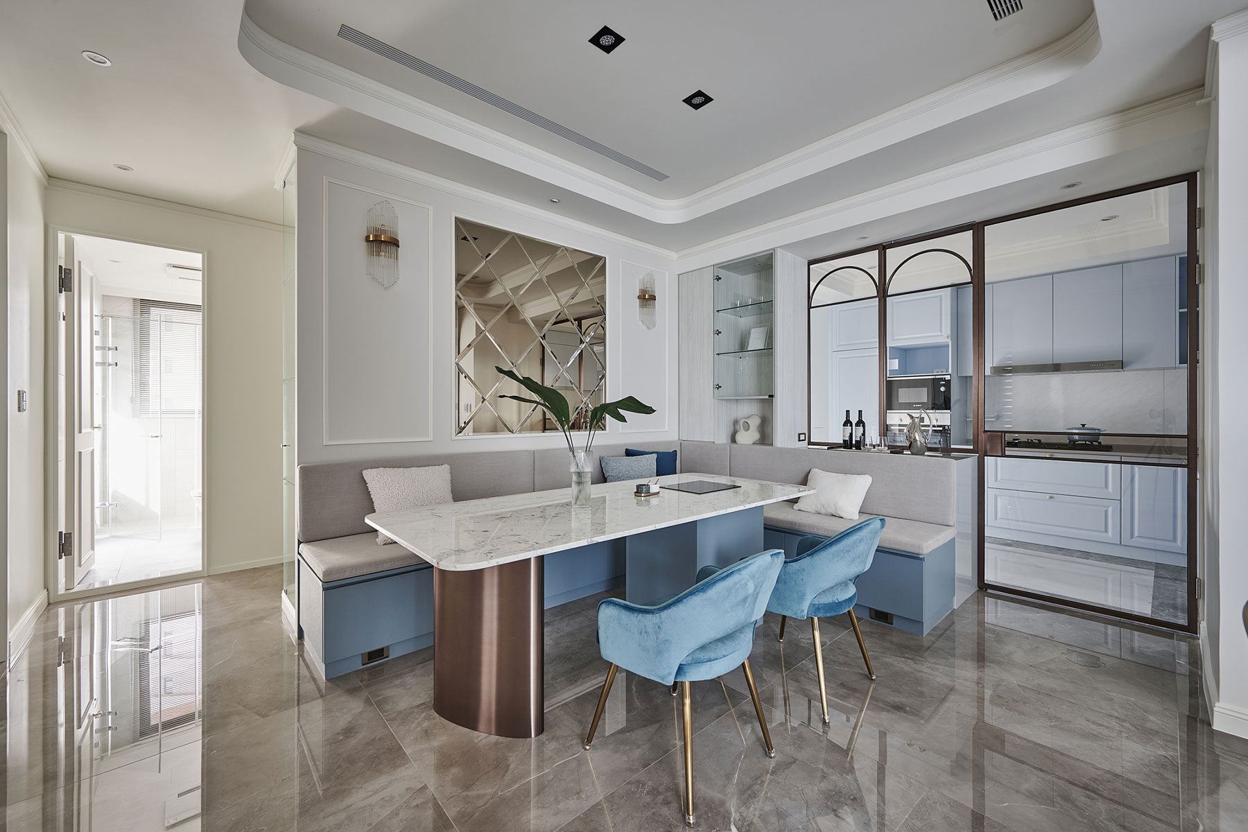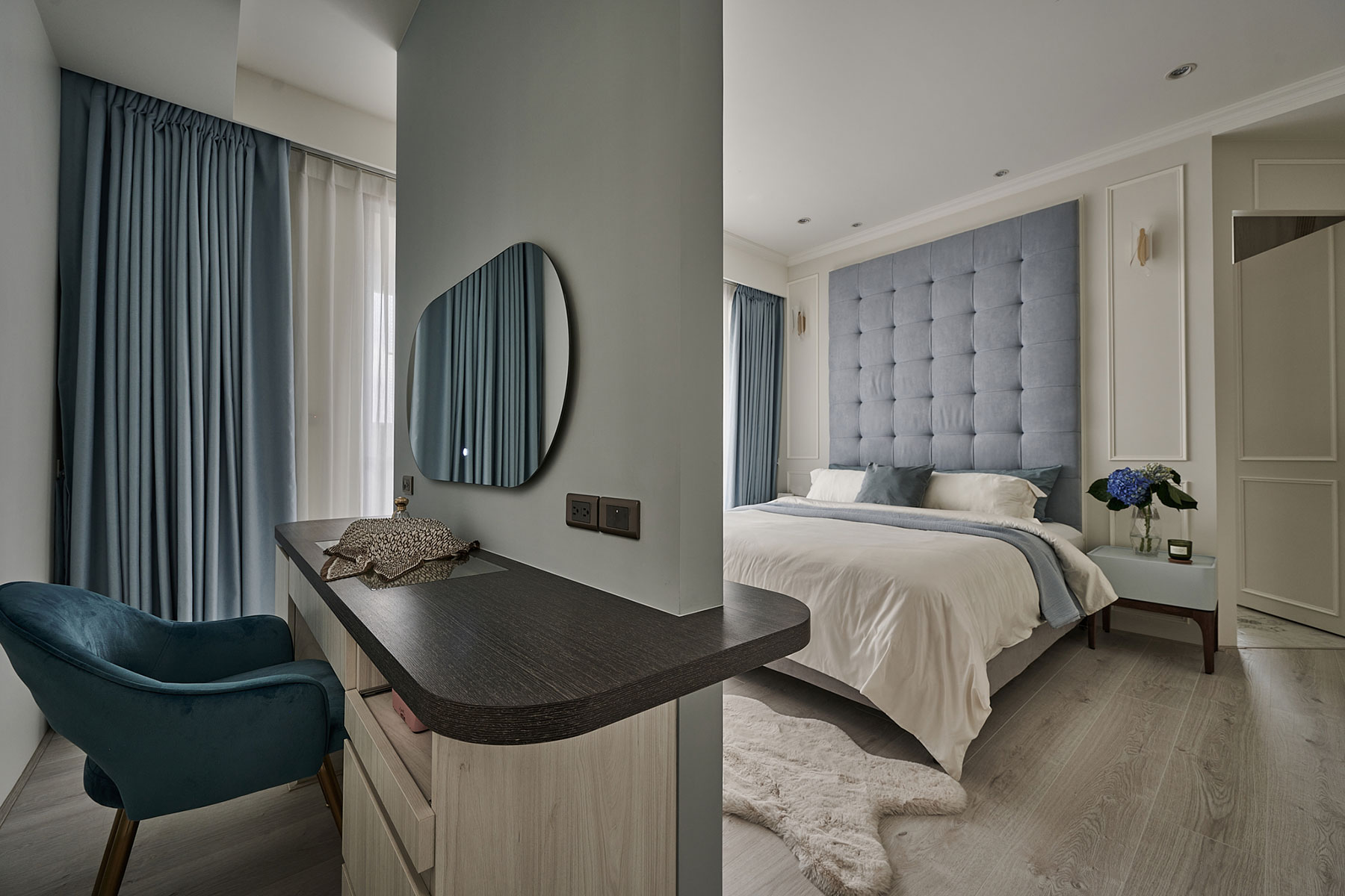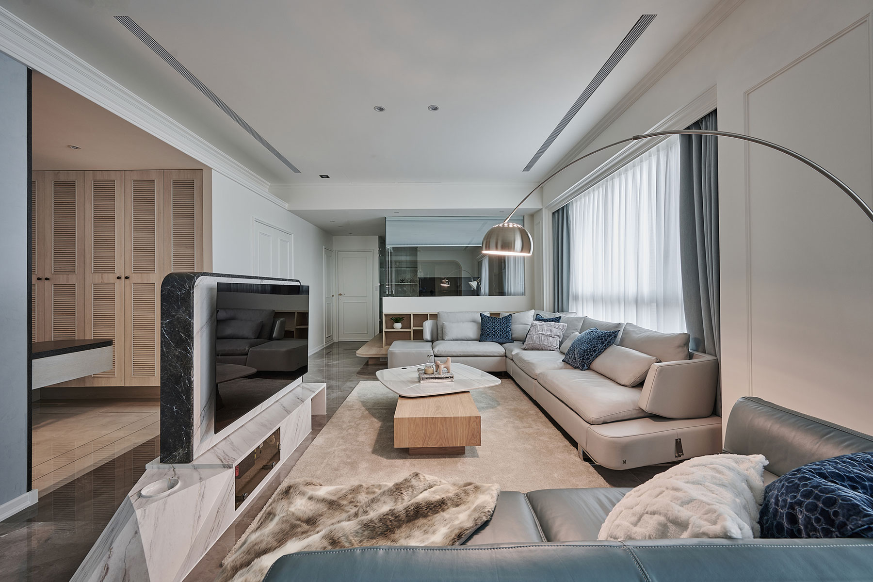 和煦天光滲過簾紗流溢入內,點亮一室輕盈素雅的淡彩,同時攜手漫布各方的和柔蔚藍,為屋中注入宛如悠遊大海的清爽自適;日夜流轉、居者歸宅,歷經外頭風塵僕僕的奔波,此刻只想靜坐於窗畔憩息、細品咖啡,沉浸於海岸般潮風輕拂、浪聲汩汩的愜意環境,洗滌竟日的疲憊身心。